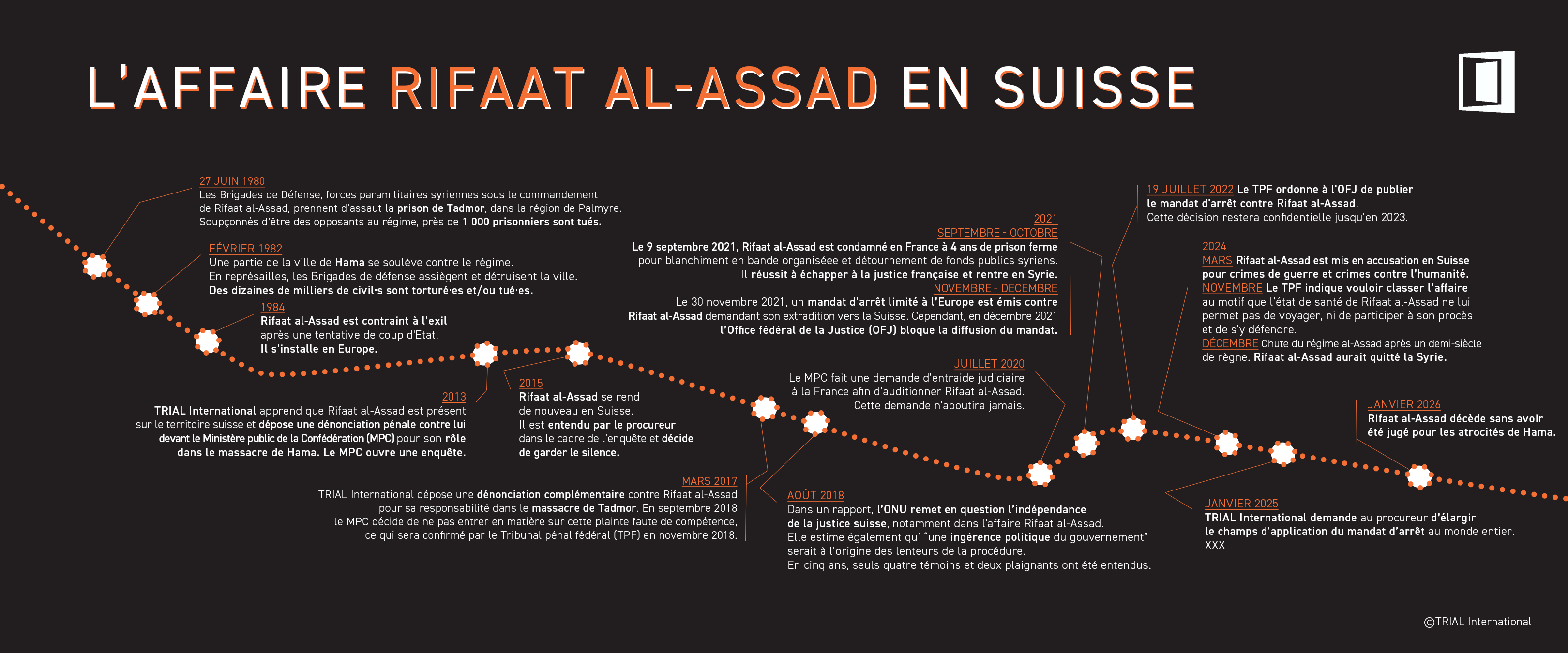 La procédure suisse visait à examiner sa responsabilité pénale alléguée, en tant que commandant des Brigades de la Défense, pour les atrocités commises lors de l’attaque de la ville de Hama lancée le 2 février 1982 par les forces gouvernementales syriennes. Cette opération, destinée à réprimer une insurrection armée contre le régime, a duré près d’un mois, au cours duquel les civils ont été piégés à l’intérieur de la ville ; entre 10 000 et 40 000 civils auraient été tués, tandis que d’innombrables autres auraient été torturés et/ou victimes de disparitions forcées.